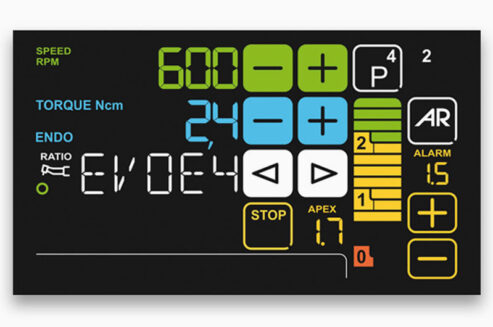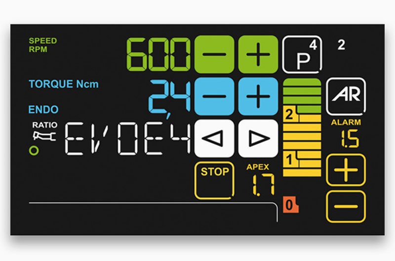 A apex távolsága a gyökércsatorna instrumentációs fázisában az LCD kijelzőn jelenik meg. A apexhez való közeledést az ENDO szoftver ellenőrzi. Amikor a csúcsot eléri, az Apex-Stop funkció megszakítja a mikromotor forgását.