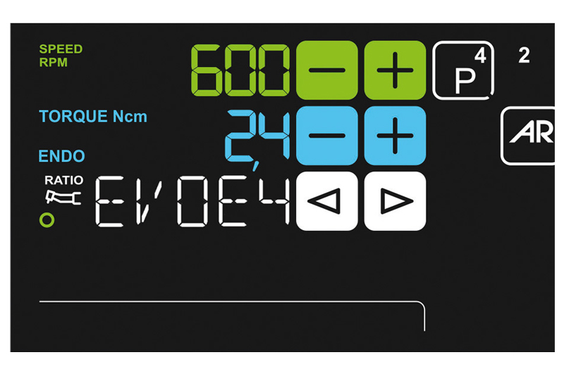 A gyökércsatorna instrumentációs fázisában az LCD kijelzőn megjelenik a csúcstól való távolság. A csúcshoz való közeledést az ENDO szoftver ellenőrzi. A csúcs elérésekor az Apex-Stop funkció megszakítja a mikromotor forgását.